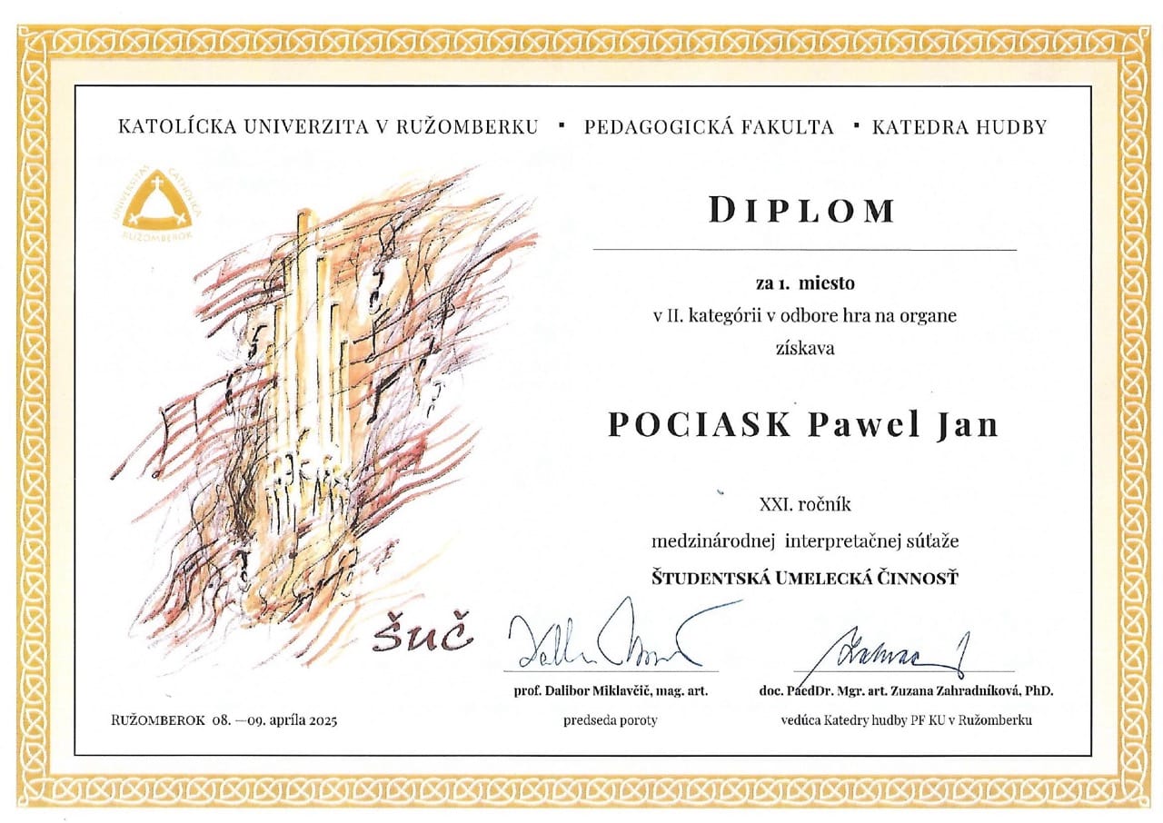 - I miejsce na Międzynarodowym Konkursie Organowym (Rużomberk 2025)