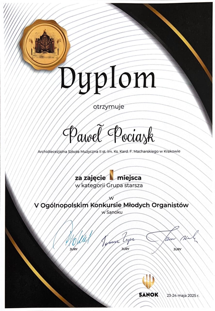 - I miejsce w grupie starszej na V Ogólnopolskim Konkursie Młodych Organistów (Sanok 2025)